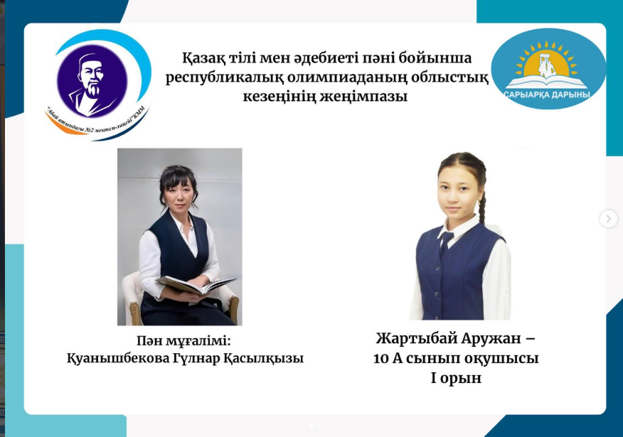 Балқаш қаласы«Абай атындағы 2-мектеп-лицейі» КММ Алғамжанова Сара 9-сынып оқушысы облыстық кезеңде жүлделі 2 орын алды. Сондай-ақ, байқаудың жүлде қорынан 700 мыңдық Сертификат иегері атанды.
