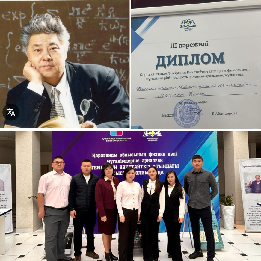 Қарағанды облысының физика пәні мұғалімдеріне арналған көрнекті ғалым,Темірғали Көкентайтегі атындағы физика пәні мұғалімдерінің облыстық олимпиадасында Абай атындағы 2 мектеп лицейіміздің физика пәні мұғалімі Махмет Кенже Саятұлы қатысып,жүлделі 3 орын дипломымен марапатталды.