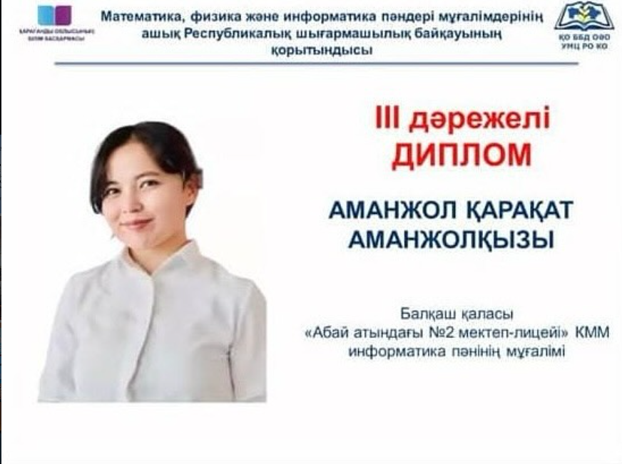 Қарағанды облысында Білім беруді дамытудың оқу әдістемелік орталығының ұйымдастыруымен өткен “Математика, физика және информатика пәні мұғалімдерінің ашық республикалық шығармашылық байқауының” қалалық және облыстық кезеңіне қатысып,жүлделі 3-орынды иеленген информатика пәні мұғалімі Аманжол Қарақат Аманжолқызын жеңісімен құттықтаймыз!